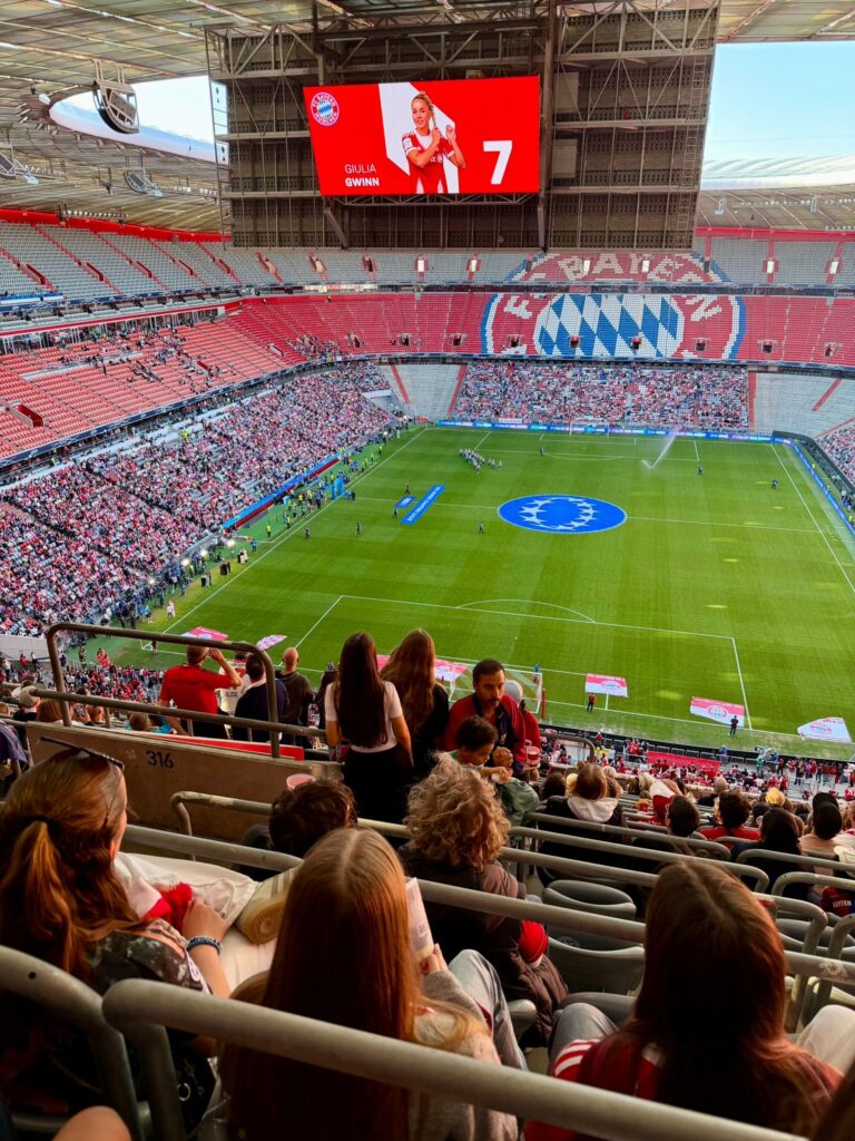 Am Samstagabend machten sich ca. 40 Spielerinnen und Betreuer der U15w, U17w und der Damenmannschaft auf den Weg in die Allianz Arena, um das Hinspiel im Champions League Halbfinale der FC Bayern Frauen gegen den FC Barcelona zu sehen. Bei herrlichem Kaiserwetter und vor einer Rekordkulisse von 31000 ZuschauerInnen, gingen die Katalaninnen zwar früh mit 1:0 in Führung, doch die Münchnerinnen hielten gut mit und konnten in der 2. Halbzeit durch Franzi Kett sogar noch ausgleichen. Eine starke Teamleistung die durchaus inspirierend für alle Anwesenden gewesen sein dürfe.